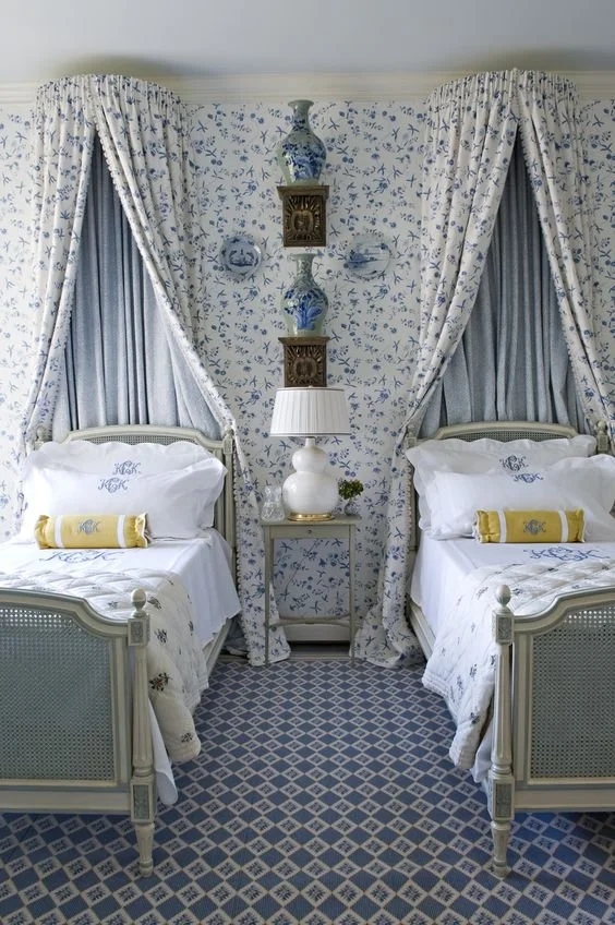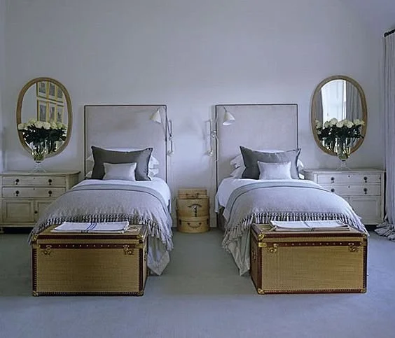 It's all about twin bedroom suites for the spare bedroom right now. Symmetrical mirror image arrangements of furniture and accessories don't have to be boring. Tickle the eye with bold prints, captivating accessories, and non-traditional beds and headboards to keep the room playful and less like a hotel suite. The pleasing symmetry of twin beds brings childhood memories of sleepovers to my mind. I've always adored this look for a guest room, and with summer travels in full swing, there's no better time than now to think about sprucing up your guest room accommodations. Get inspired with these bedrooms that have taken symmetry to another level!