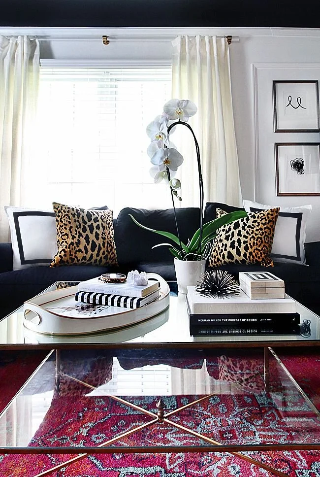 Keep your coffee table simple with black, white, and gold or silver accents to accentuate with your spotted pillow. White and black coordinate with any color palette and remain timeless. To add dimension and instant color pop, show off your lifestyle books or magazines and top off with a printed toss-all tray for keys or candies.
